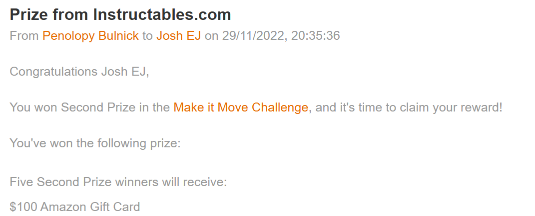 6. Second prize in Autodesk Instructables Make it Move Challenge.