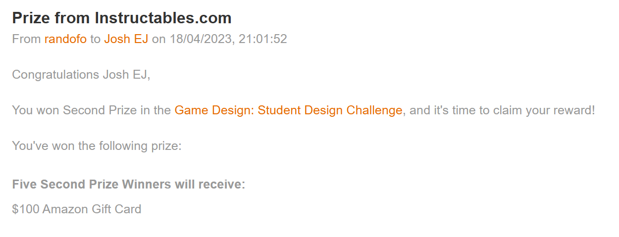 5. Second prize in Autodesk Instructables Game Design: Student Design Challenge.