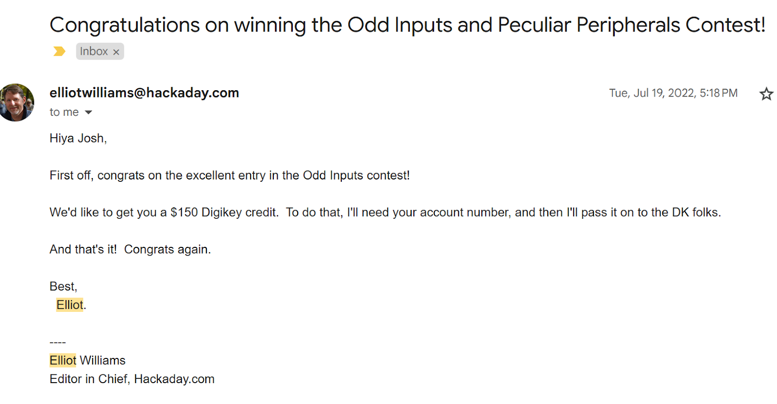 3. Winner in Hackaday odd inputs and peculiar peripherals contest sponsored by Digi-Key Electronics.