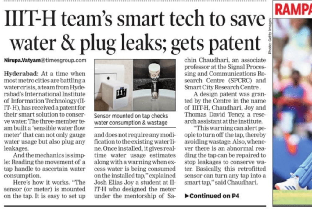 - Times of India: IIIT-Hyderabad team’s smart tech to save water plug leaks; gets patent