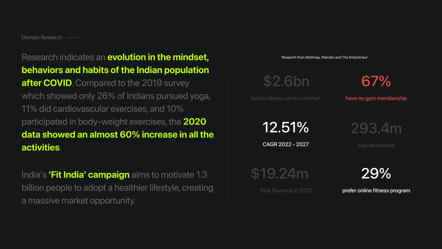 In this project, we aim to explore the fitness landscape in India, analyze people’s motivations and challenges, and gather insights from relevant stakeholders to develop a personalised solution.