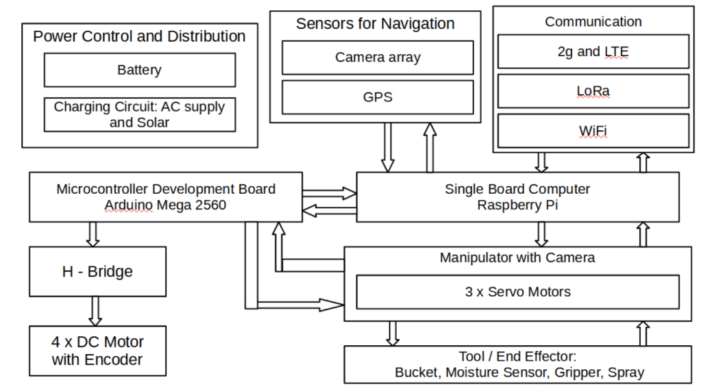 With the initial design, we have considered various possible wireless protocols such as 2g, LTE, WiFi and LoRa. The robot charges when parked at a base station, the base station connects to the grid and also Solar panels to charge the robot. We hope to create a modular design that can use either lithium ion or lead acid battery types.