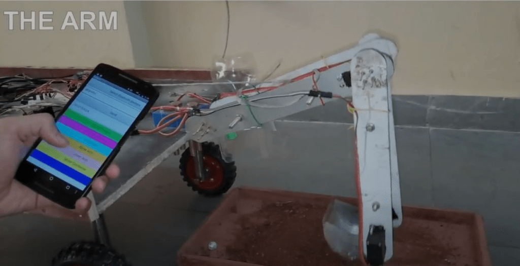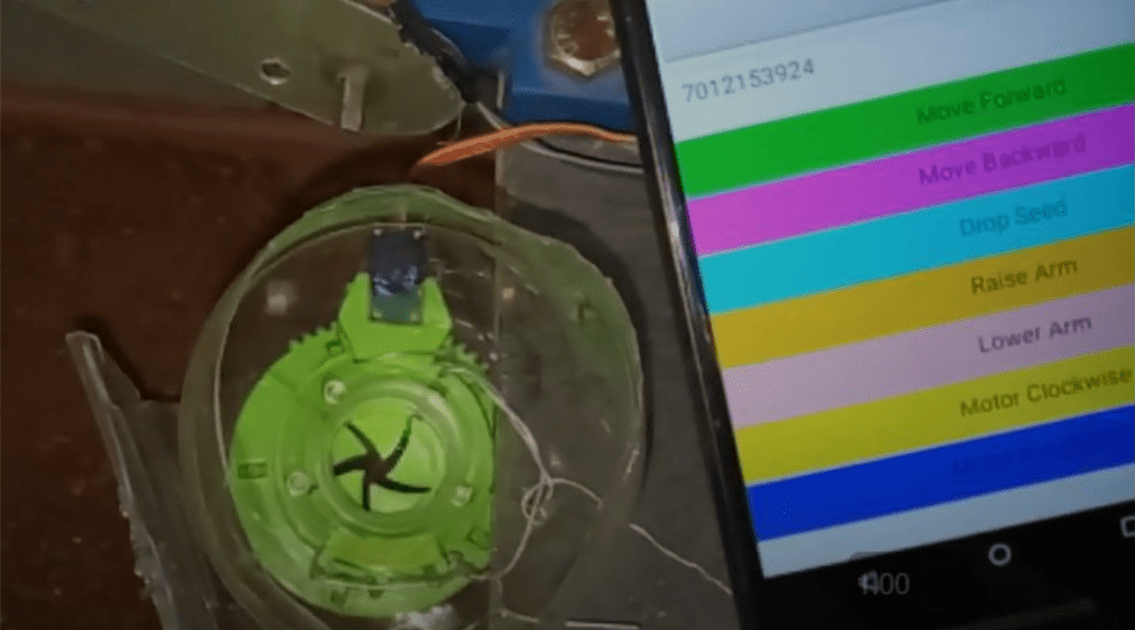 The initial prototype of the robot used plywood for the body and the four legs of the robot were made from mild steel. The prototype used the manipulator along with the bucket tool to plow the soil. An open source seed dropping mechanism1 was used for the initial prototype, the mechanism uses a servo motor to restrict the movement of seeds from the seed storage container, the servo controls the flow of seeds by varying the passage which is available for the seeds to pass through. Thus seeds of different sizes can be dispensed by using this mechanism. An android application was developed to control the robot manually. The application allowed us to move the robot, control the manipulator and also dispense the seed.