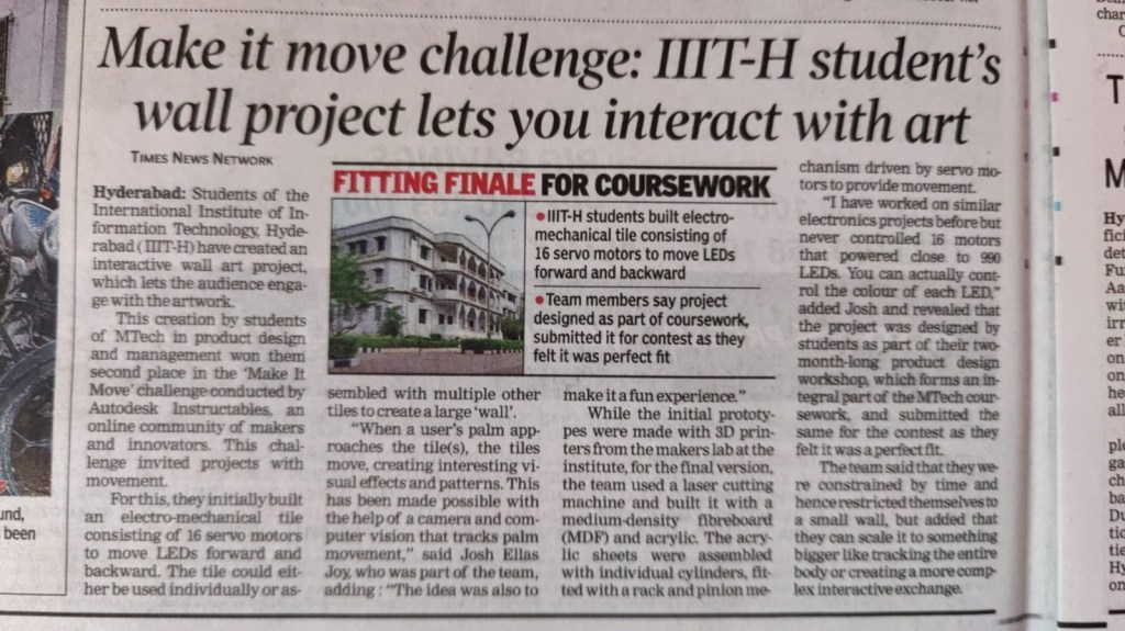 This Project was done by Vinaya Gopi, Anuj Malviya, Josh Elias Joy, Krishna Sandilya, Srinivas Saladi, Bhargava Tadi, Venkat Sai and Poorna Chandra as a part of the Product Design Workshop course at IIIT Hyderabad. We would also like to thank our Professors Prakash Yalla, Raghu Reddy, and Guna Deepak.