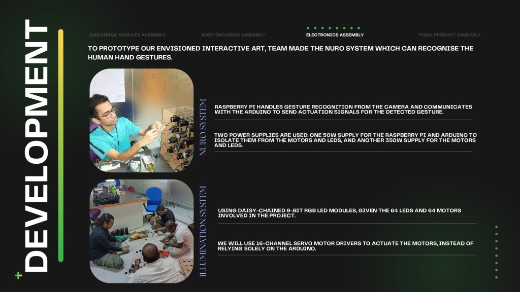 In this project, we build a single interactive electromechanical tile that is modular and can be scaled up to any dimension one desires. The Tile is electromechanical, it uses Servo motors to move RGB LEDs forward and backward. Each Tile consists of 16 servo motors controlled by 16-bit channel connector controlled by an Arduino Module. The Tiles can function individually or can be assembled and expanded to work together with other Tiles. Various visual effects and patterns can be created with this setup and this gets even more interesting as you scale up the Tile to multiple pieces. The interaction element has been added using a camera and Computer vision to track the palm of the hand.