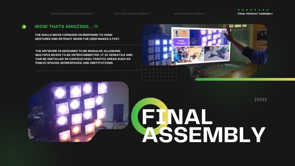 An interactive electromechanical artwork that comes to life through hand gestures.