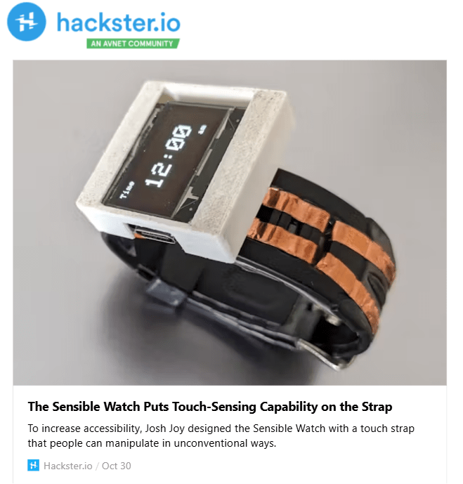 The research was done by interacting and observing individuals with upper limb differences performing day-to-day tasks to understand the needs and challenges faced by upper limb-different individuals. Existing tools for limb-different individuals were also looked at. Most individuals would just look at the timekeeping functionality present on the face of a digital or analog watch and not access other functionality that needs to be accessed by navigating through buttons. To test the usability of a touch-sensitive strap an MVP was built using a microcontroller with a capacitive sensing feature, which has been demoed in the above video. The user can perform swipe gestures on the strap to navigate between different menu screens. The next step would be to add pressure-sensing resistive touch so that the system works with prosthetics, this is done by embedding flexible electronics in a strap. Flexible 3d printable filament will be used to make the strap, this allows us to iterate designs that are optimized for users to be worn by one hand. Designing a watch user interface optimized for touch strap inputs requires multiple iterations to create something that is highly intuitive.