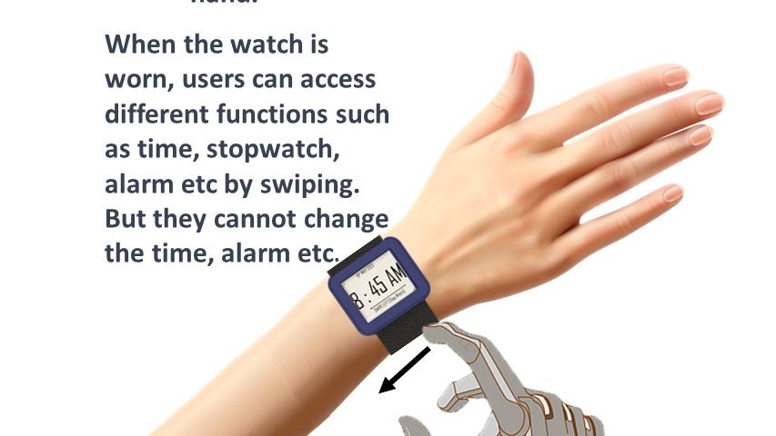 The sensible watch’s touch-sensitive strap replaces buttons, enabling upper limb-different individuals to interact with the watch using their affected arm, or different parts of their body (eg Chin, Elbow etc). The watch also works with prosthetics.