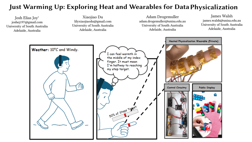 1) Just Warming Up: Exploring Heat and Wearables for Data Physicalization ACM International Conference on Tangible, Embedded and Embodied Interaction (TEI), 2026 Josh Elias Joy, Xiaojiao ’Lily’ Du, Adam Drogemuller, and James Walsh ACM: https://dl.acm.org/doi/10.1145/3731459.3779350